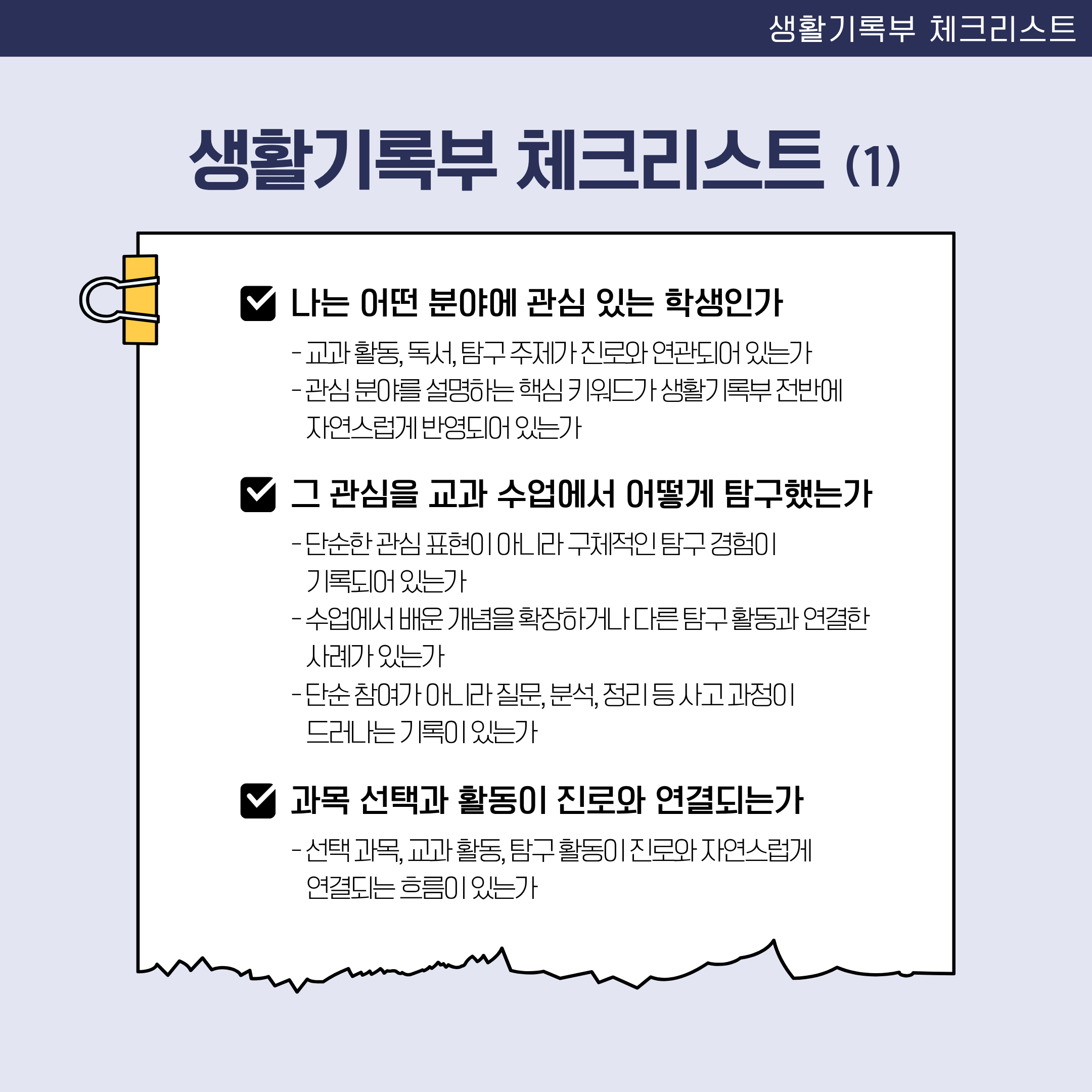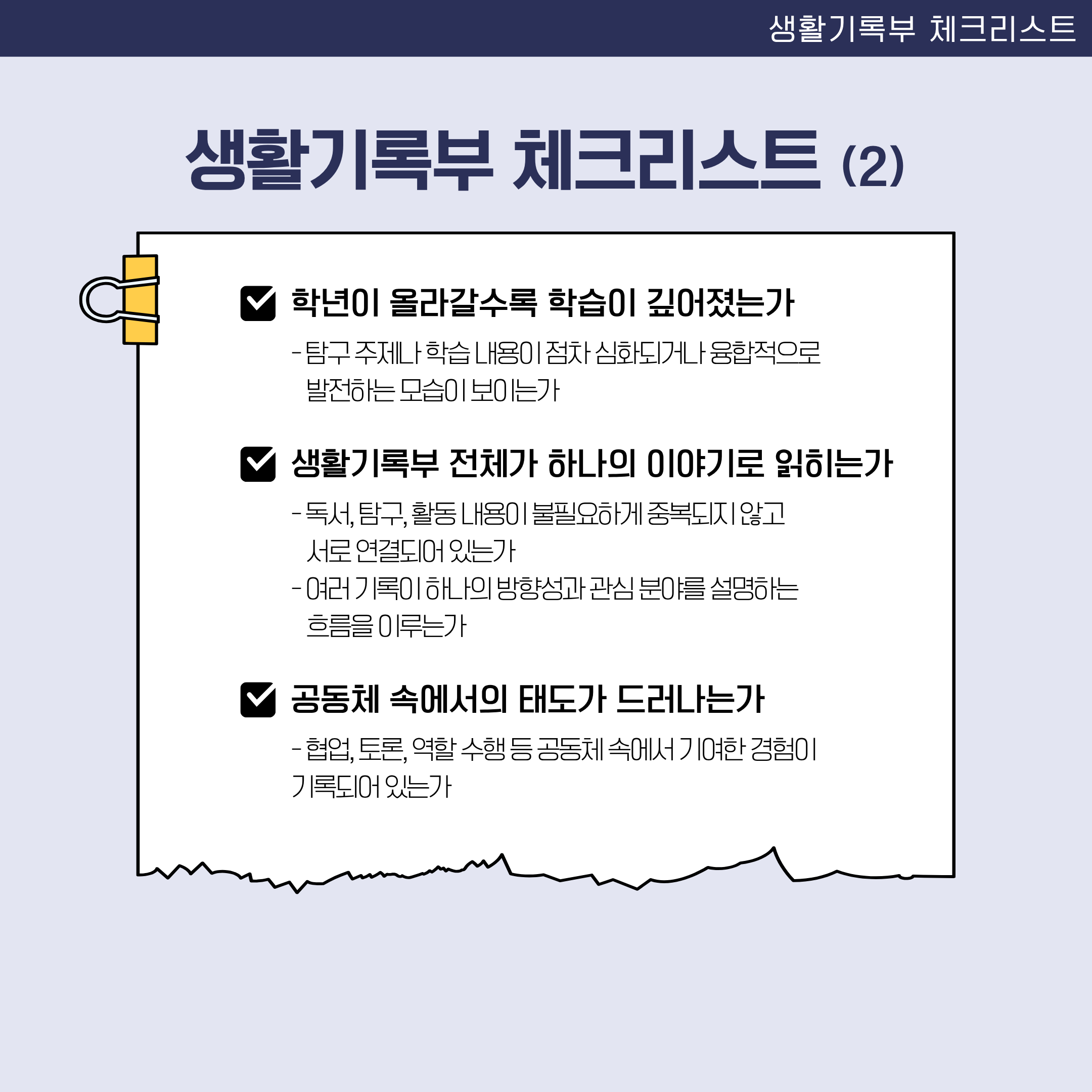ÇлýºÎÁ¾ÇÕÀüÇü¿¡¼ Áß¿äÇÑ °ÍÀº Ȱµ¿ÀÇ °³¼ö°¡ ¾Æ´Ï¶ó ±â·ÏÀÌ ÇϳªÀÇ ÇлýÀ» ¼³¸íÇÏ´Â ±¸Á¶ÀÔ´Ï´Ù. ÀÔÇлçÁ¤°üÀº »ýȰ±â·ÏºÎ¸¦ ÅëÇØ ÇлýÀÌ ¹«¾ù¿¡ °ü½ÉÀ» °¡Áö°í, ¾î¶»°Ô ¹è¿ì°í ¼ºÀåÇß´ÂÁö¸¦ ÀнÀ´Ï´Ù. µû¶ó¼ »ýȰ±â·ÏºÎ¸¦ °ü¸®ÇÒ ¶§´Â ´ÙÀ½°ú °°Àº ±âÁØÀ» Á¡°ËÇØ º¼ Çʿ䰡 ÀÖ½À´Ï´Ù.